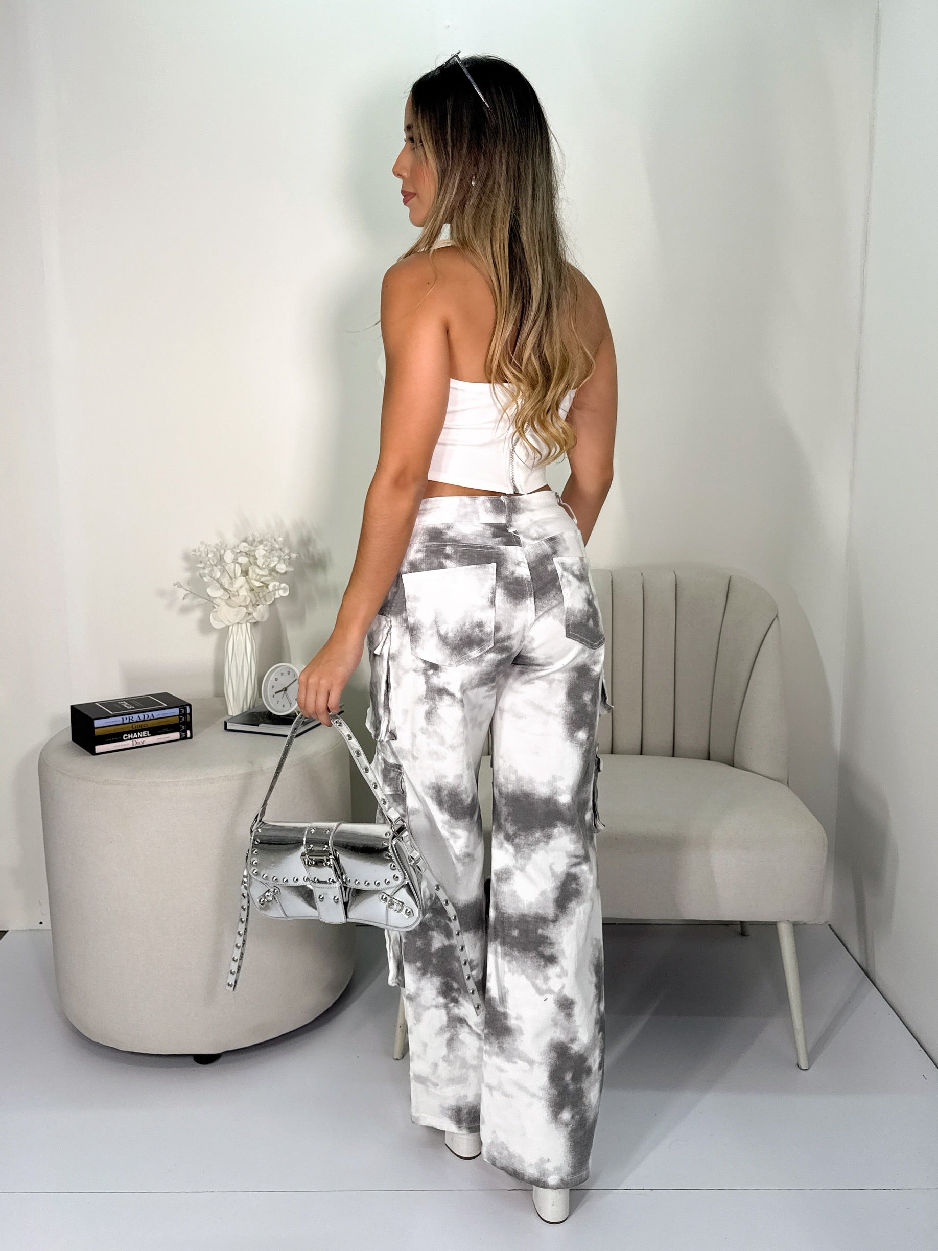 Pantalón Cargo Satén Seis Bolsillos Ancho Blanco