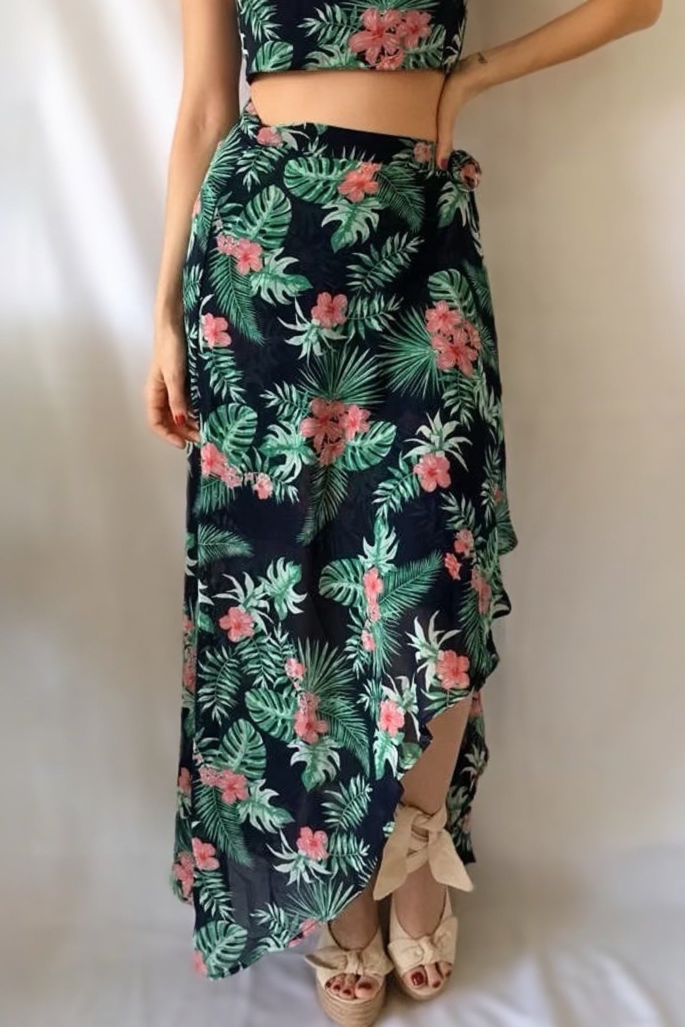 CONJUNTO FALDA - TOP AZUL FLORES ROSA