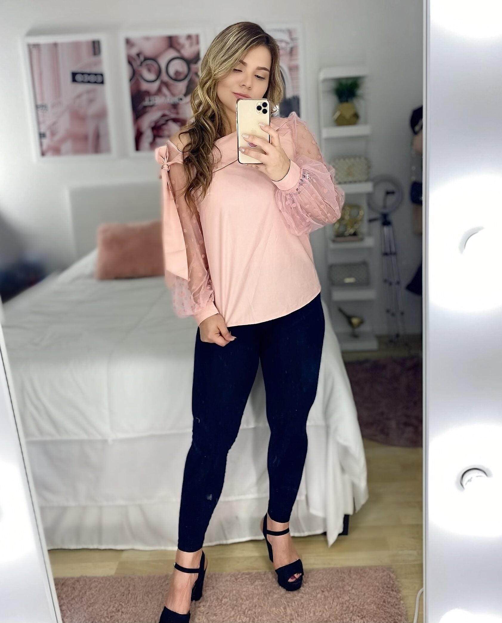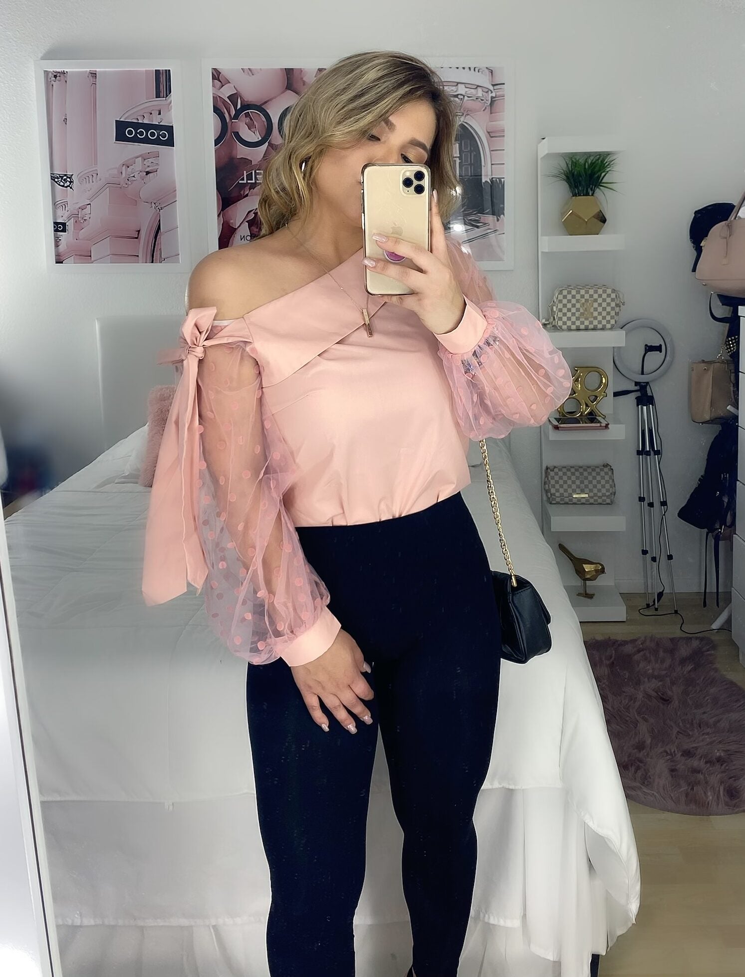 BLUSA ROSADA MANGA LUNARES CON NUDO